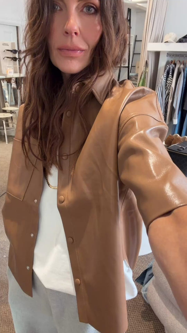 Looks Like: Light brown short sleeve cropped vegan leather shirt